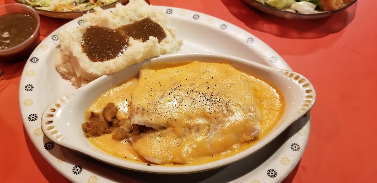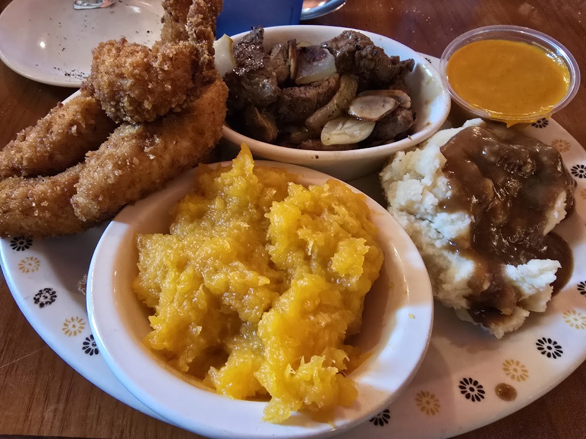 Pretty much everything was good, actually very good. From the Caesar salad and dinner rolls to the main meal. Mary had fish and chips and I had fried haddock shrimp and scallops. All the fried food was lightly battered and cooked to perfection, very tasty and moist. Mary usually doesn't like french fries but she ate every single one of these. The waitress was very friendly an answered all of our questions pleasantly. All the food came out right on time. We would definitely recommend the Chuck Wagon.