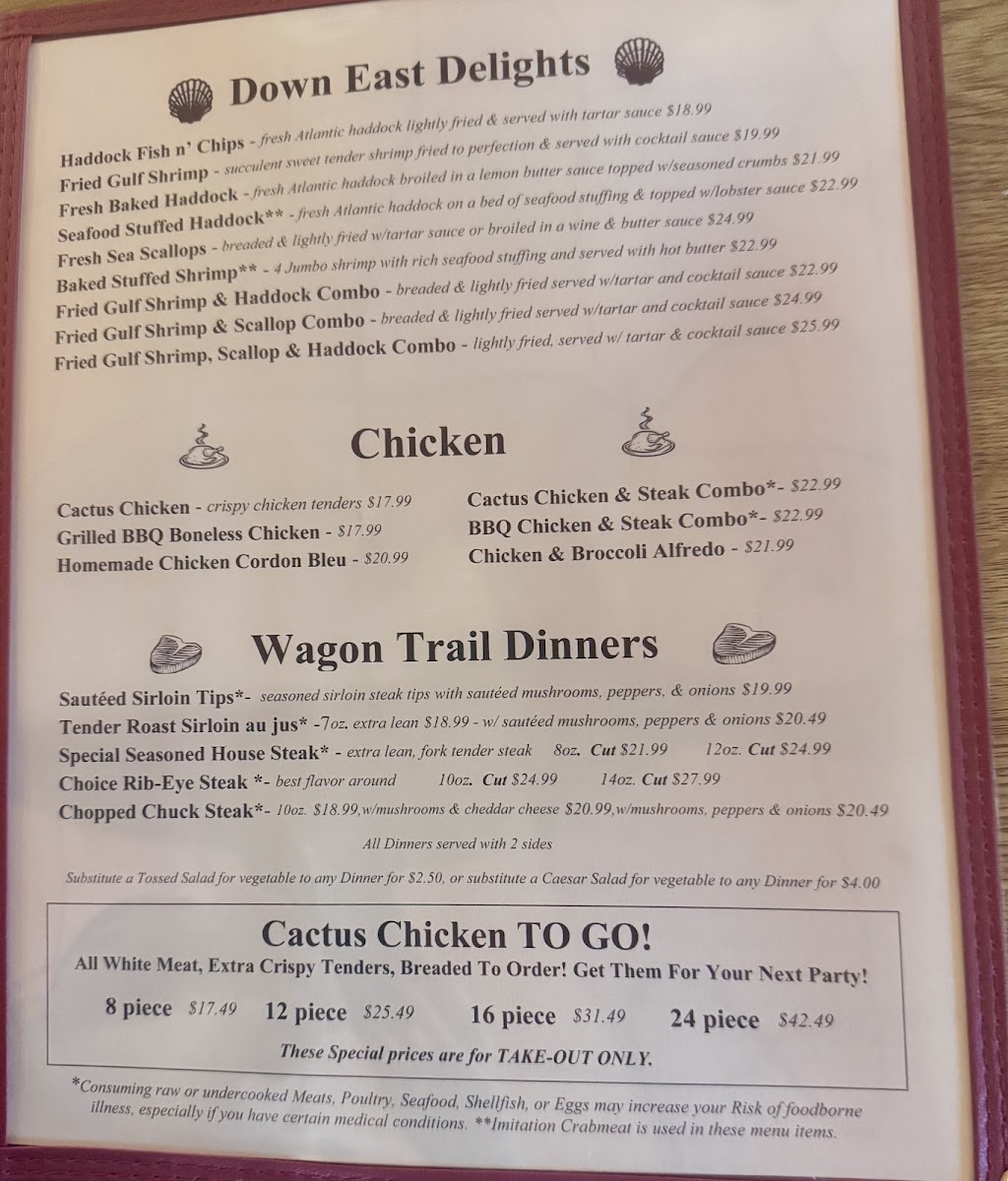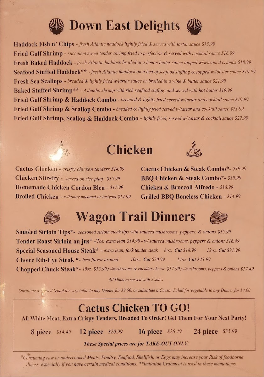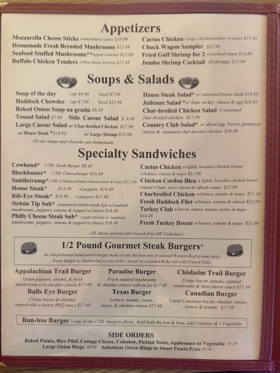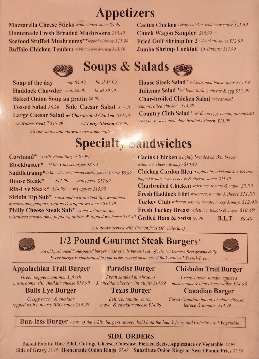 The Chuck Wagon Restaurant offers a menu that reflects a classic American dining experience, blending comforting dishes with a relaxed, welcoming atmosphere. The style is straightforward and approachable, featuring hearty portions that suit casual lunches or leisurely dinners in a cozy, small-town setting.