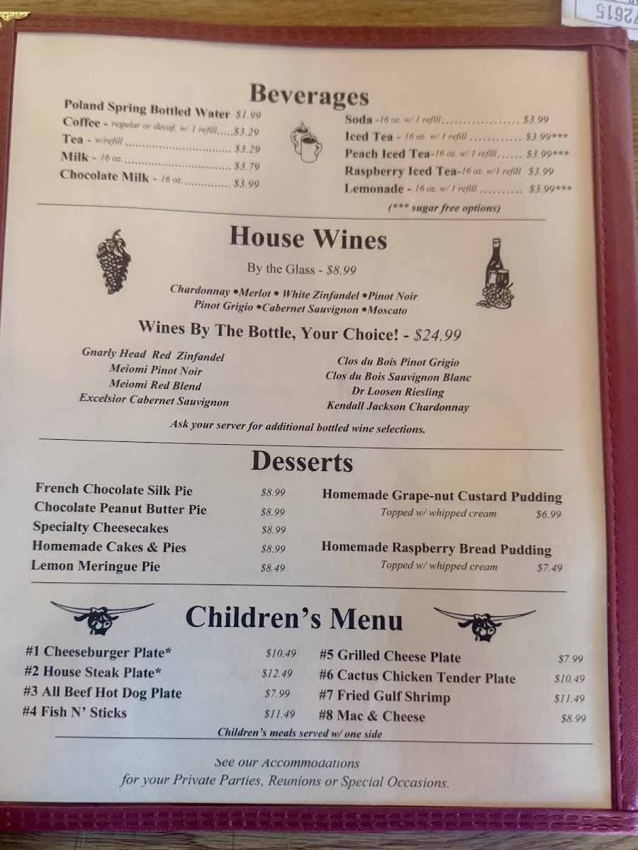 The dessert offerings, including homemade GrapeNut custard pudding and a selection of pies and cheesecakes, provide a sweet finish that fits perfectly with the restaurant’s homey vibe. Alongside classic American fare, the wine list featuring choices such as Chardonnay, Merlot, and Pinot Noir complements the meals without overwhelming the simple charm of the dishes.